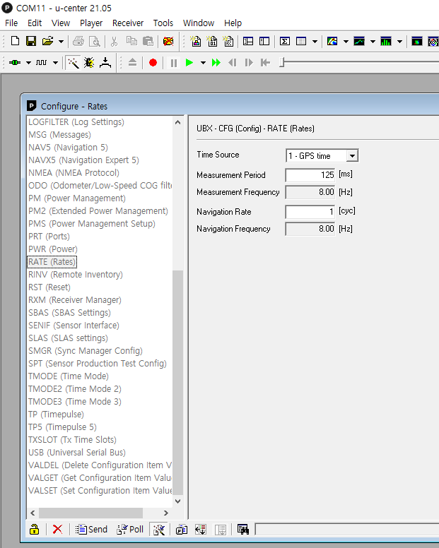 RATE 설정으로 이동하여 Measurement Period를 125ms로 설정하여 Frequency가 8Hz가 되도록 맞추었다.